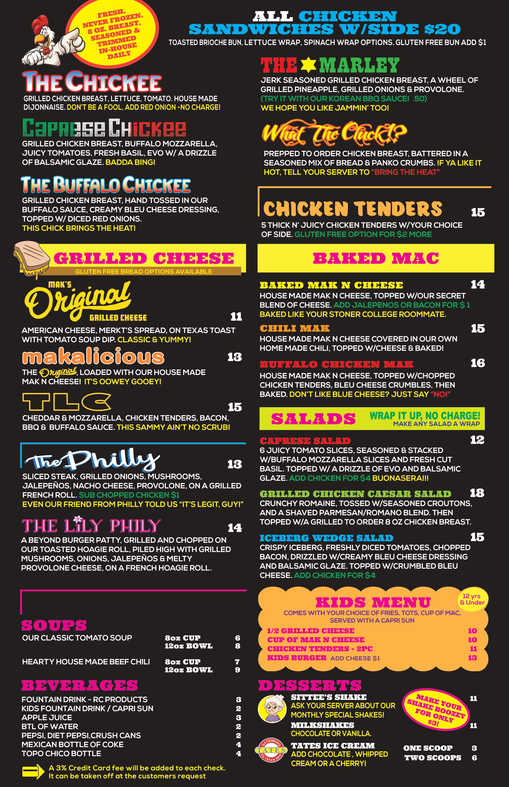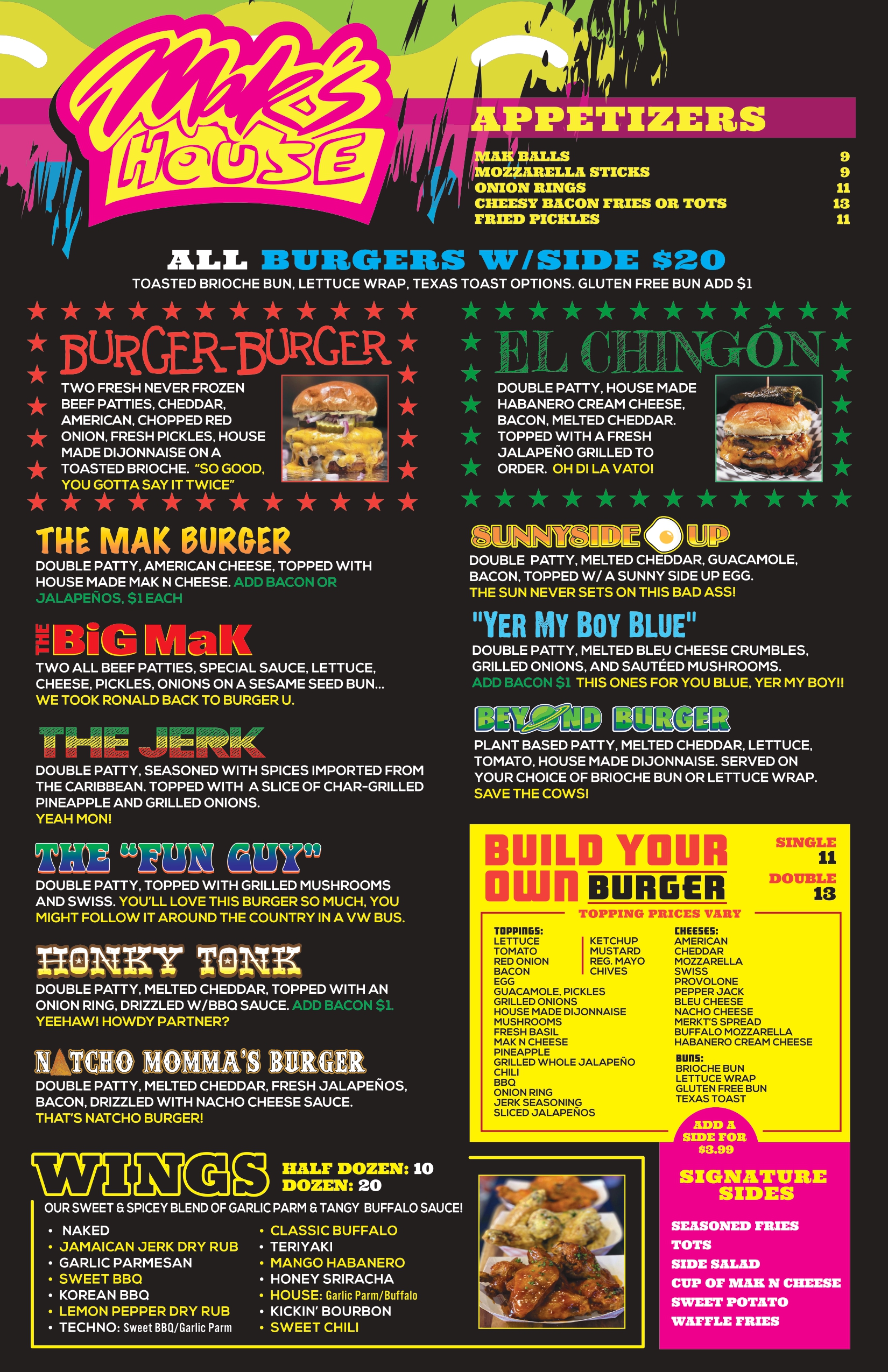 PLAIN OL BURGER, EL CHINJON, BEYOND BURGER, HONKEY TONK, BURGER BURGER, SUNNY SIDE UP, FAHGHETTABOUTIT BURGER